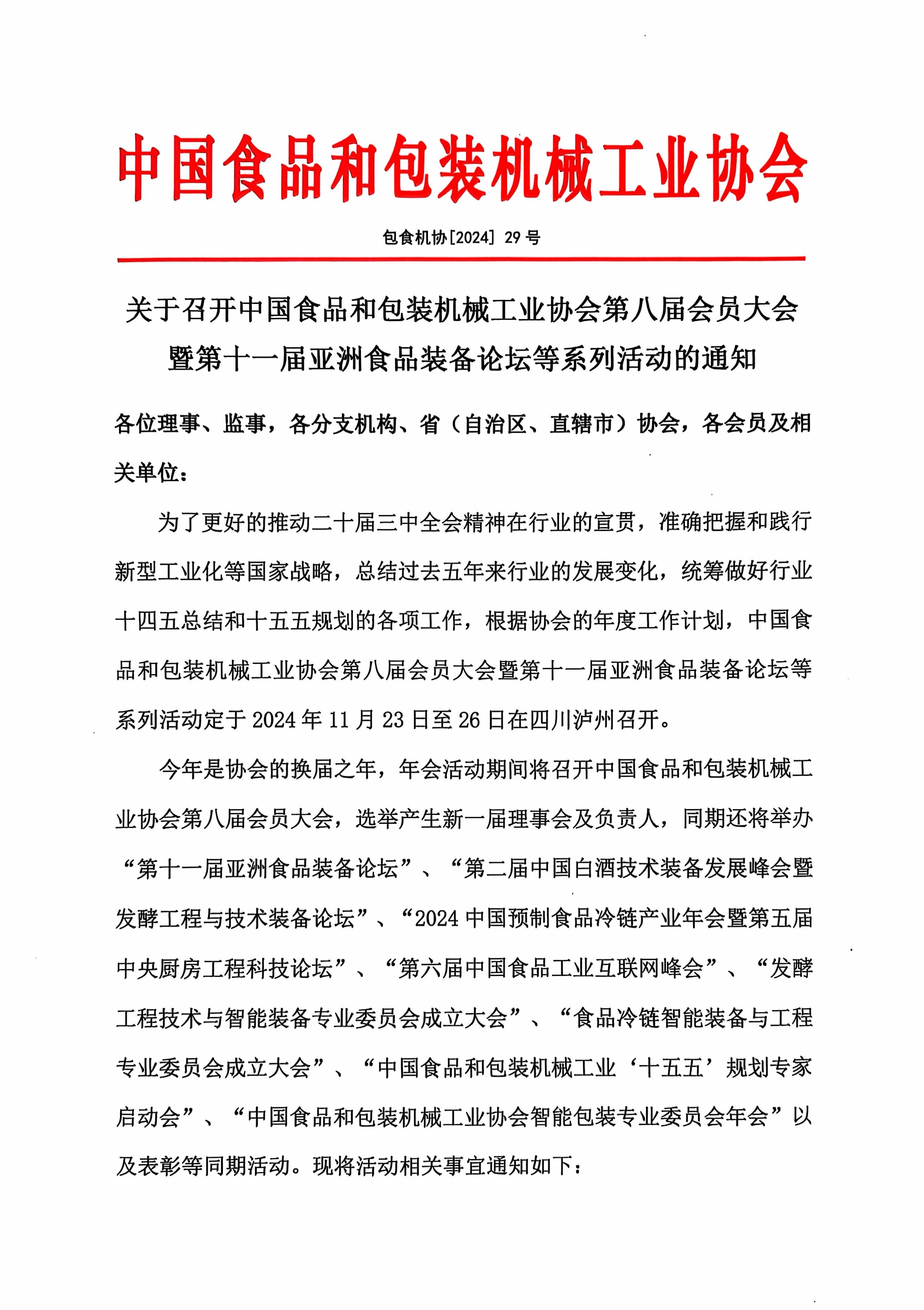 關(guān)于召開中國食品和包裝機械工業(yè)協(xié)會第八屆會員大會暨第十一屆亞洲食品裝備論壇等系列活動的通知